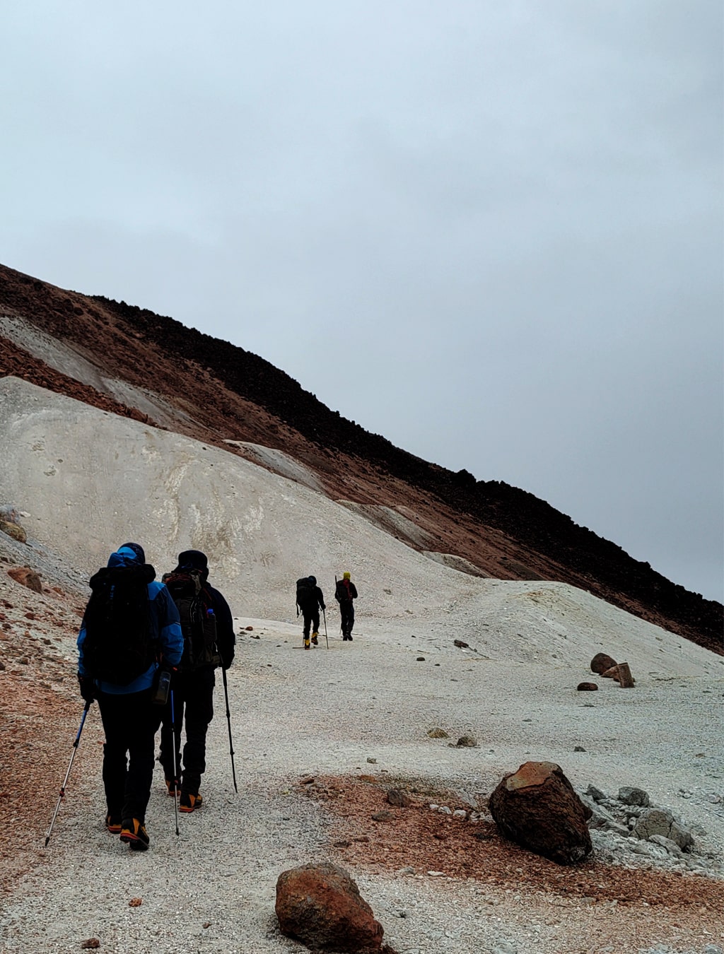 Salida de madrugada para el intento de cumbre. El ascenso se realiza por laderas amplias de arena volcánica y roca suelta, con un ritmo constante y pausas programadas.