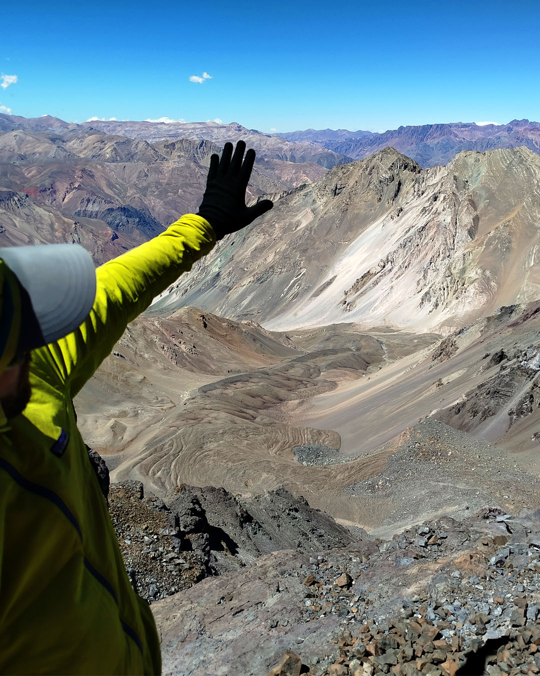 Desde la cumbre del Cerro Negro del Inca, a 4.611 metros sobre el nivel del mar, el paisaje se abre de manera espectacular. Frente a nosotros se alza la pared y silueta del Cerro Aconcagua (6.960 msnm), dominando el horizonte y recordándonos la magnitud real de la cordillera.