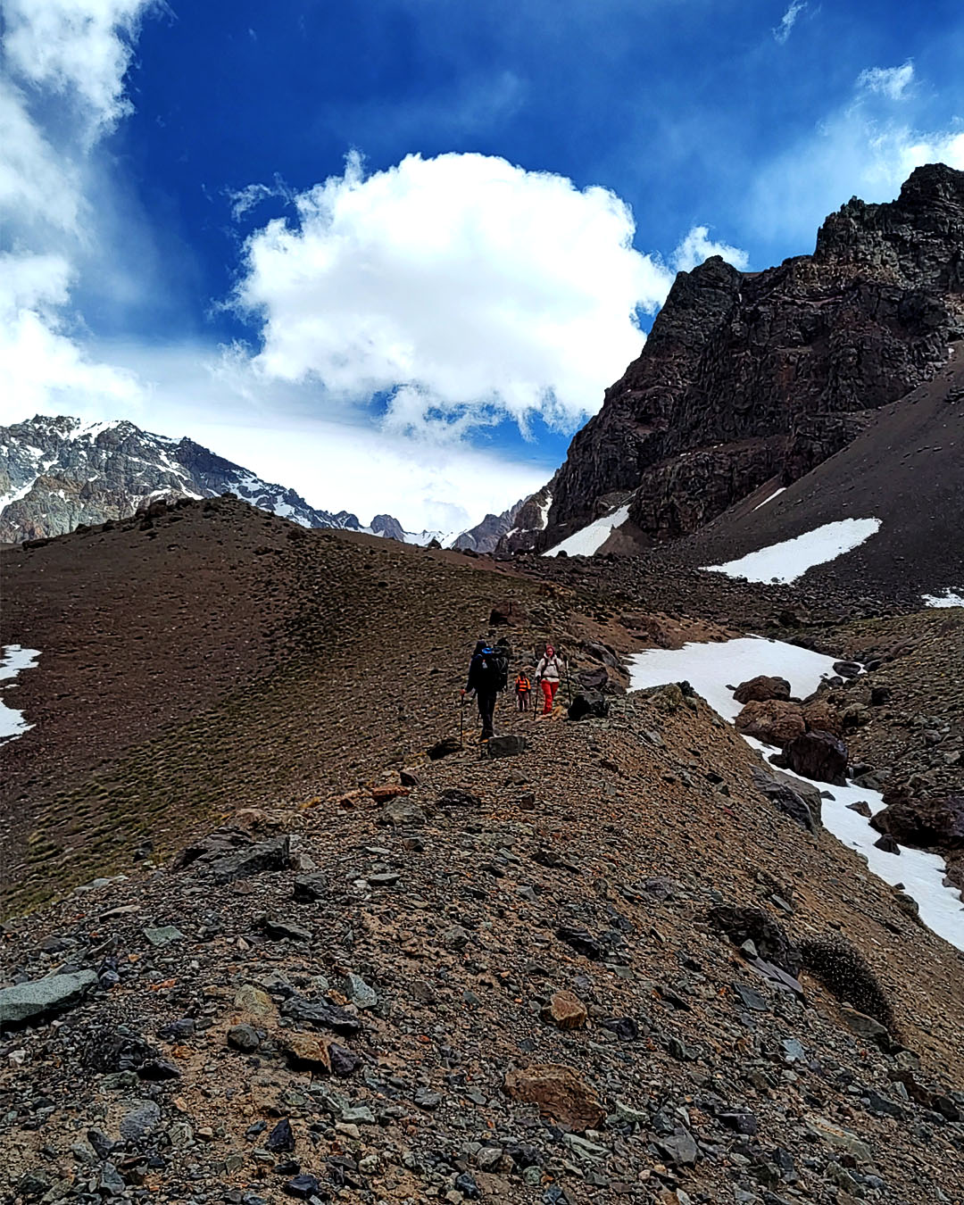 Durante el ascenso, recorremos senderos serpenteantes que atraviesan distintos ambientes de los Andes Centrales, pasando de laderas secas a terrenos más rocosos y expuestos. A medida que ganamos altura, la exigencia aumenta y la altitud pone a prueba la resistencia, pero cada tramo ofrece vistas panorámicas cada vez más amplias.